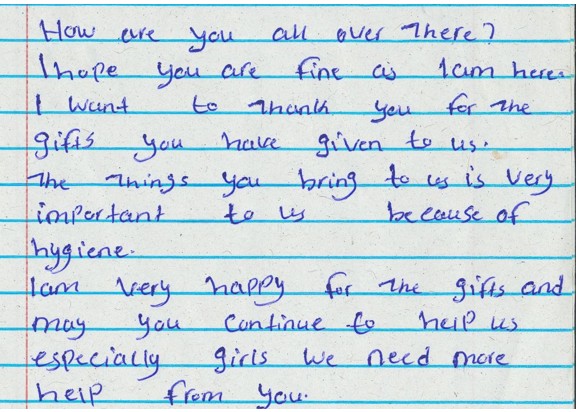 Elizabeth writes this letter to thank you for the gift of a Hygiene Kit that she has been given to help her stay in school. It includes sanitary pads, soap and deodorant – ensuring she doesn’t have to miss classes and can stay in school with dignity and confidence.